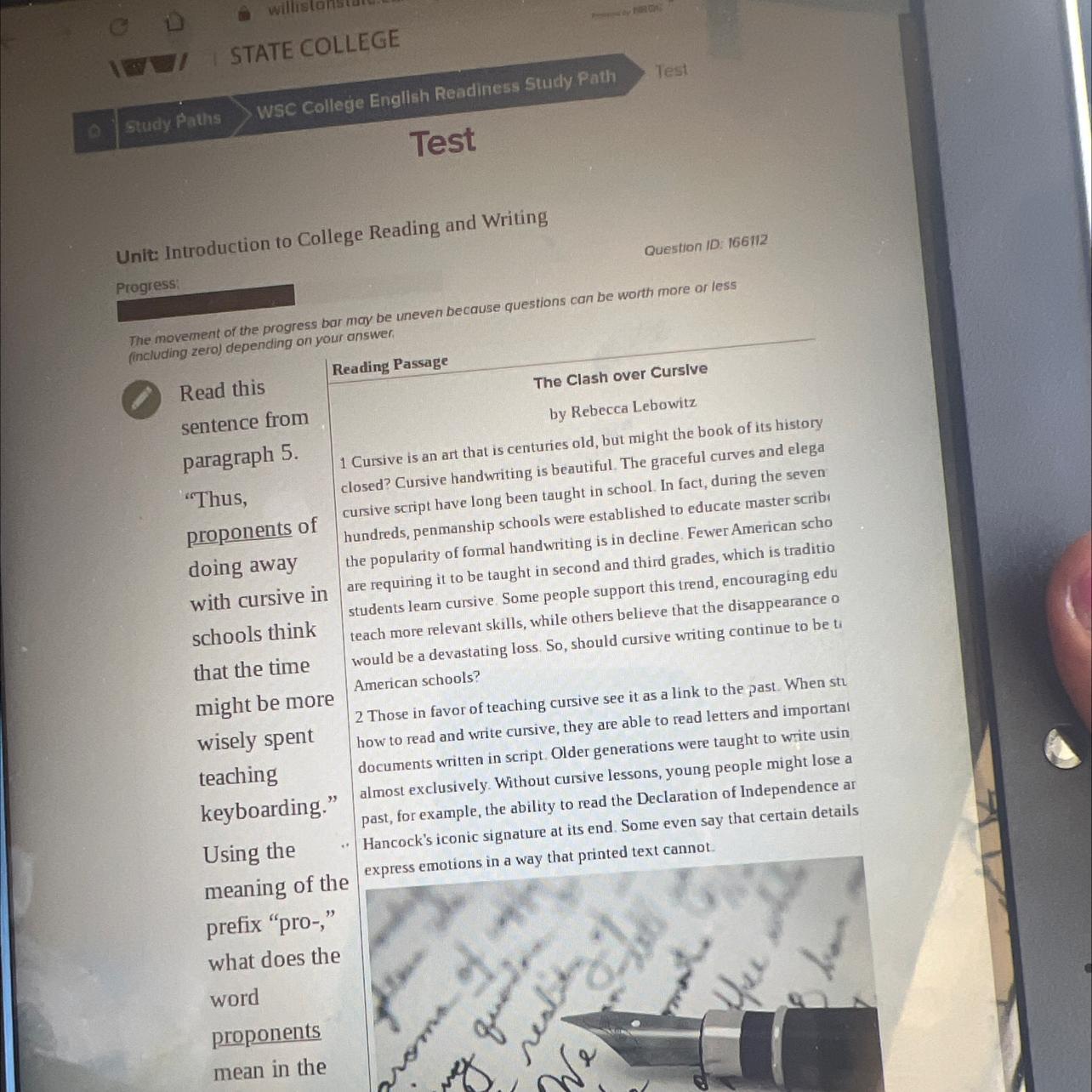 "Thus, proponents of doing away with cursive in schools think that the time might be more wisely spent teaching keyboarding." Using the meaning of the prefix "pro-," what does the word proponents mean in the sentence?