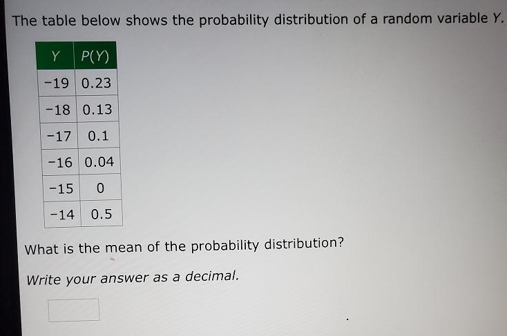 The table below shows the probability distribution of a random variable Y. Y P(Y) -19 0.23 -18 0.13 -17 0.1 -16 0.04 -15 0 -14 0