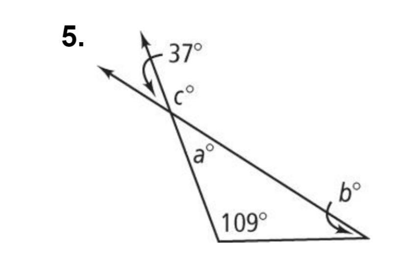 Hence, the value of a is 37°, the value of b is 34° and the value of c is 143° in the given triangle.