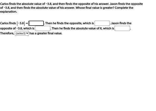 inds the absolute value of his answer. Whose final value is greater? Complete the explanation. Carlos finds |-3.8| = -Then he finds the opposite, which is . Jason finds the opposite of -3.8, which is . Then he finds the absolute value of it, which is Therefore, (select) has a greater final value.
