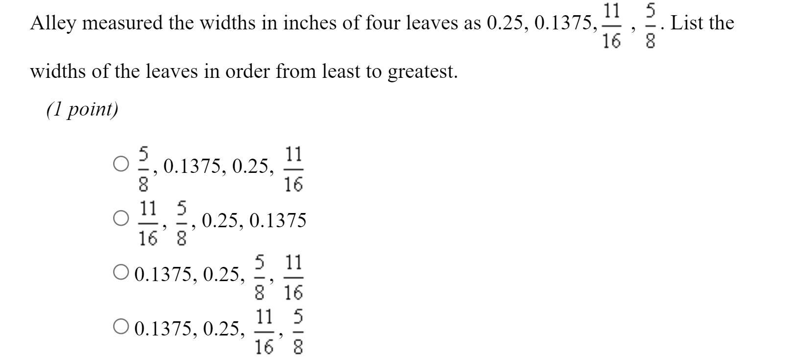 The least to greatest or increasing order of the given data set will be 0.1375,0.25,5/8,11/16 thus, option (C) is correct.