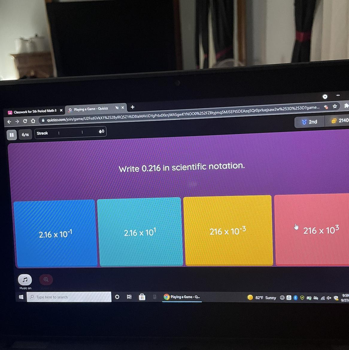 In this case, we initially had the number 0.216, as you can see, we have three digits on the right of the point, then we must move the dot 3 times, then the representation in the scientific notation of this number is: