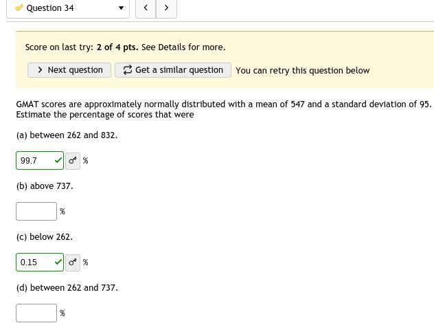 (d) To find the percentage between 262 and 737, we will need first to convert both into z: