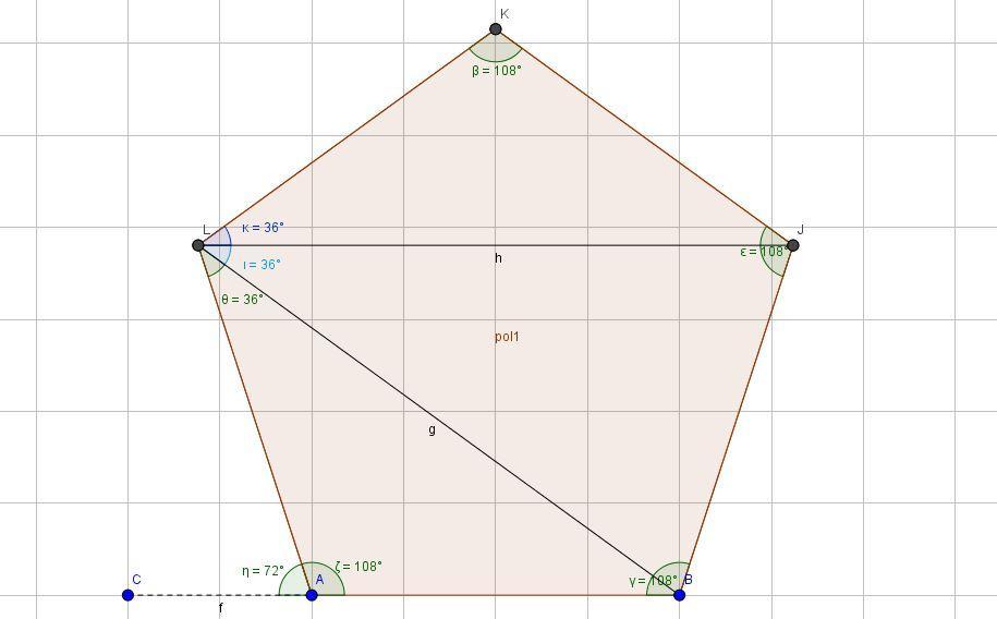 4) If we trace from each diagonal one line segment, in a regular pentagon that will form 3 triangles with one-third of 108º,i.e.,36º