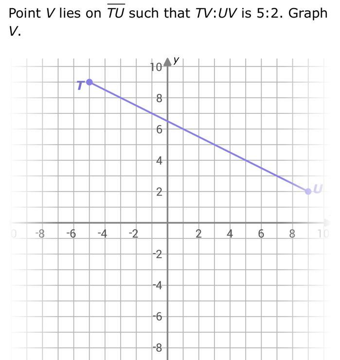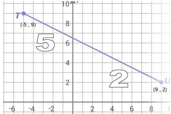 \textit{internal division of a line segment using ratios} \\\\\\ T(-5,9)\qquad U(9,2)\qquad \qquad \stackrel{\textit{ratio from T to U}}{5:2} \\\\\\ \cfrac{T\underline{V}}{\underline{V} U} = \cfrac{5}{2}\implies \cfrac{T}{U} = \cfrac{5}{2}\implies 2T=5U\implies 2(-5,9)=5(9,2)
