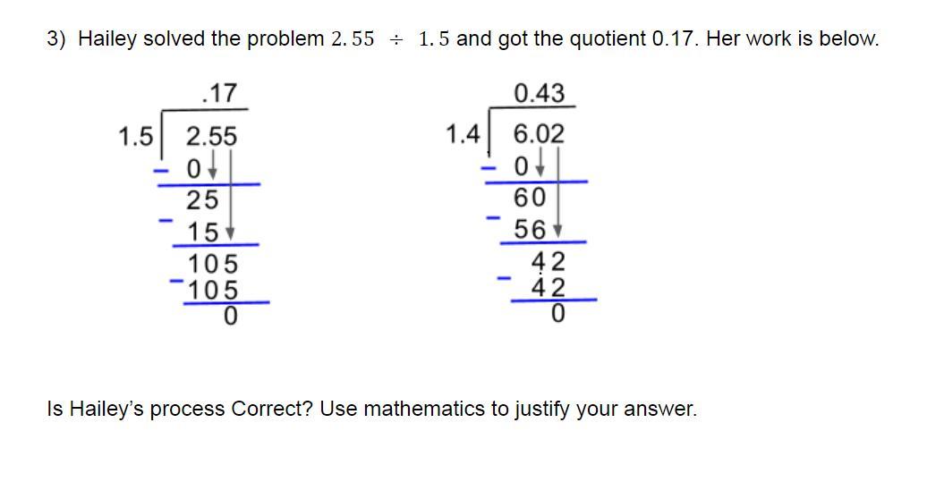 When Hailey solved the problem 2.55 ÷ 1.5 and got the quotient 0.17, the process isn't correct as she should put the 1 before the point.