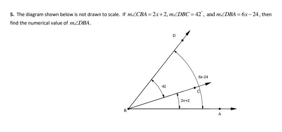 The diagram shown below is not drawn to scale. If m∠CBA=2x+2, m∠DBC=42°, and m∠DBA=6x-24, then find the numerical value of m∠DBA