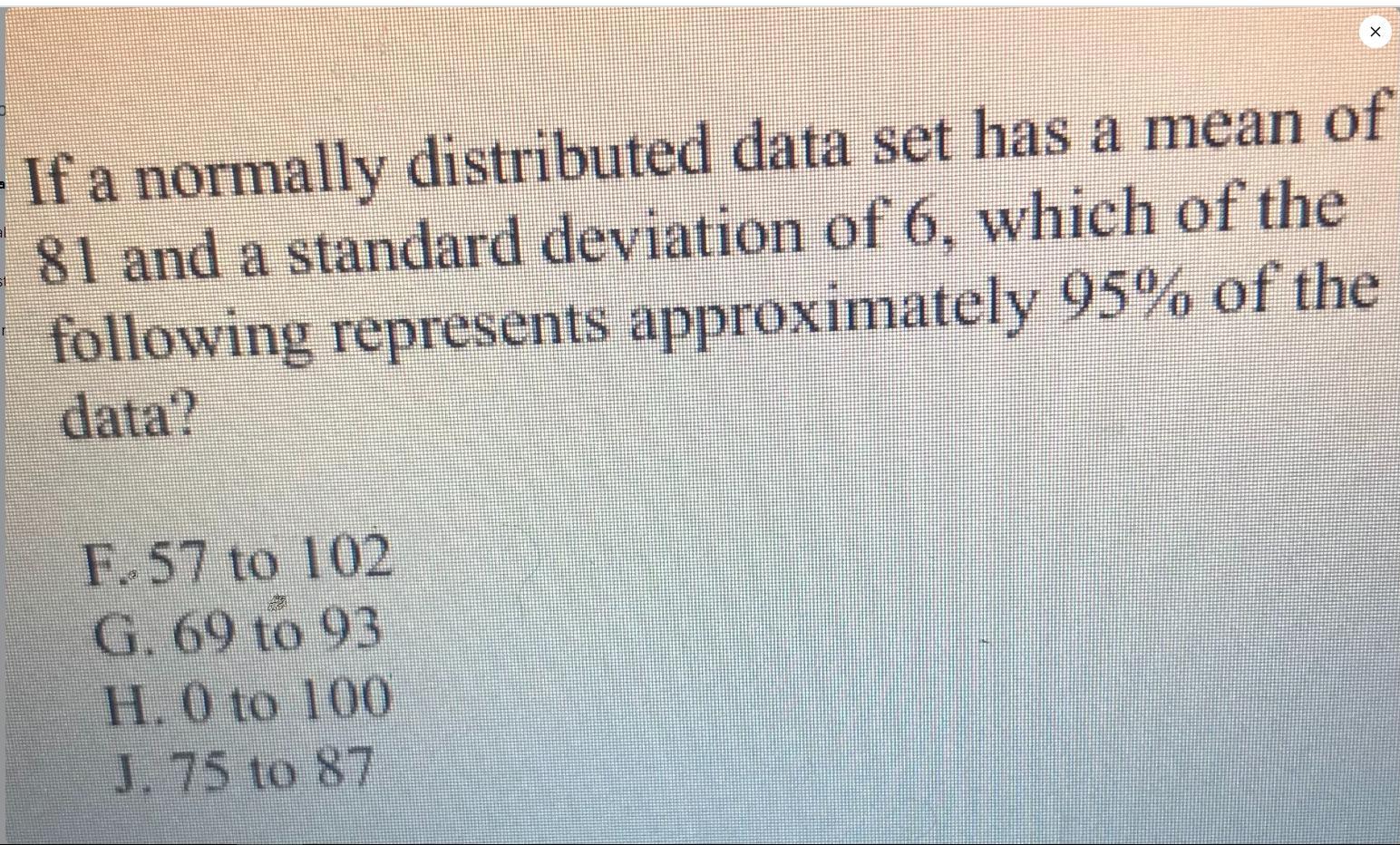 If a normally distributed data set has a mean of81 and a standard deviation of 6, which of thefollowing represents approximately