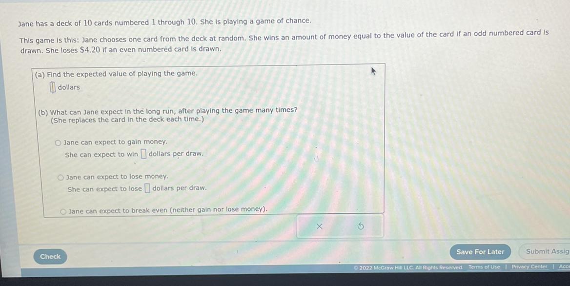 <h2>Jane can expect to gain money</h2><h2>She can expect to win $0.40 per draw</h2>