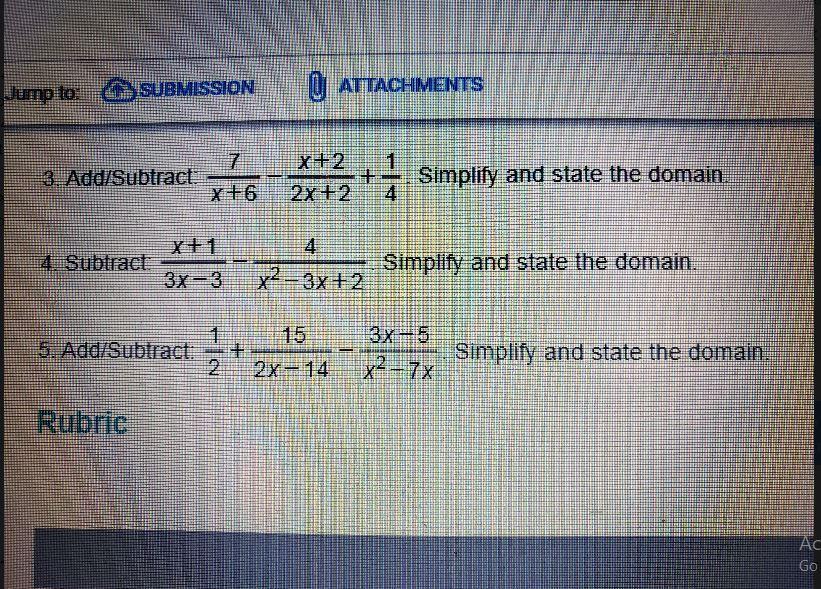 7 x+2 1 3. Add/Subtract: + Simplify and state the domain. 2x + 2 4 x+1 4. Subtract: 4 x2-3x+2 Simplify and state the domain. 3x