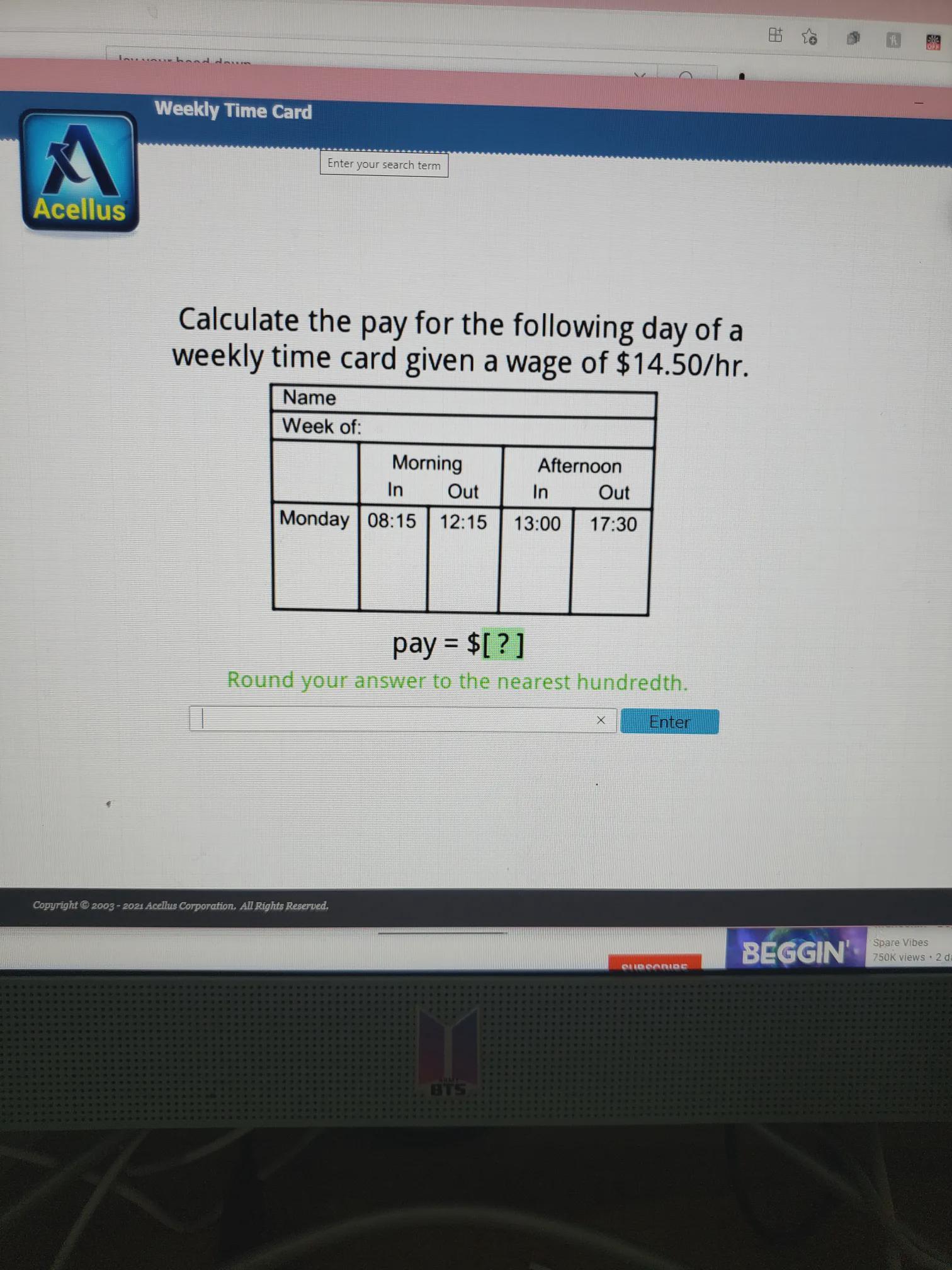 | 08:15 12:15 Afternoon In Out 13:00 17:30 pay = $[?] Round your answer to the nearest hundredth. Can you please just give me the direct answer for the pay cause I don't have mutch time to answer this problem.