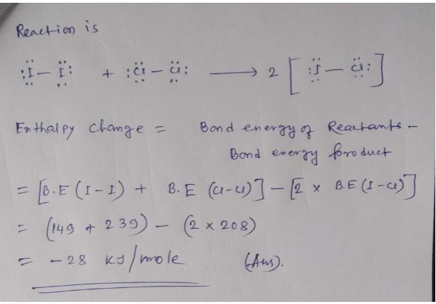 e average bond enthalpies (linked above) to calculate the enthalpy change for the following gas-phase reaction. I2(g) +Cl2(g) 2ICI(g) To analyze the reaction, first draw Lewis structures for all reactant and product molecules.Include all valence lone pairs in your answer. Draw the reaction using separate sketchers for each species. One molecule per sketcher, please. Separate multiple reactants and/or products using the + sign from the drop-down arrow.Separate reactants from products using the symbol from the drop-down menu. If you have to draw H2, draw H-H.