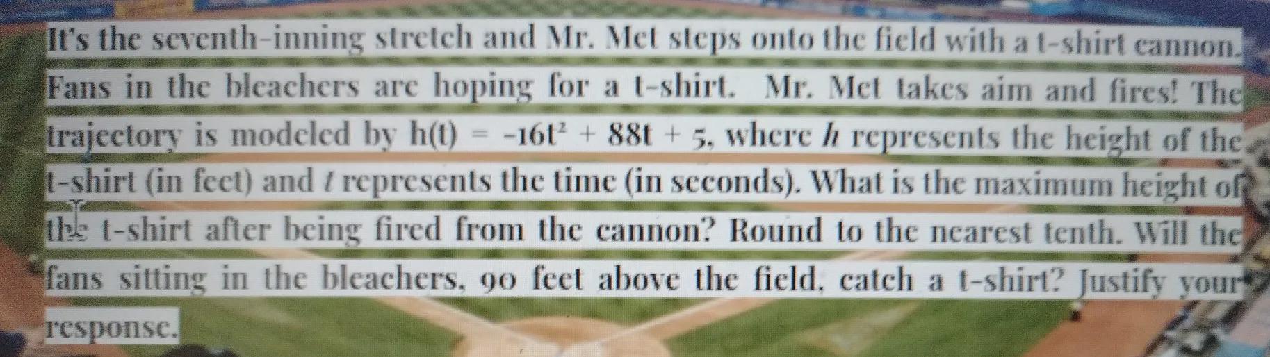 Since the maximum height of the t-shirt is 126 feet, then yes, there is a chance that the fans sitting in the bleachers 90ft above the field will catch a T-shirt.