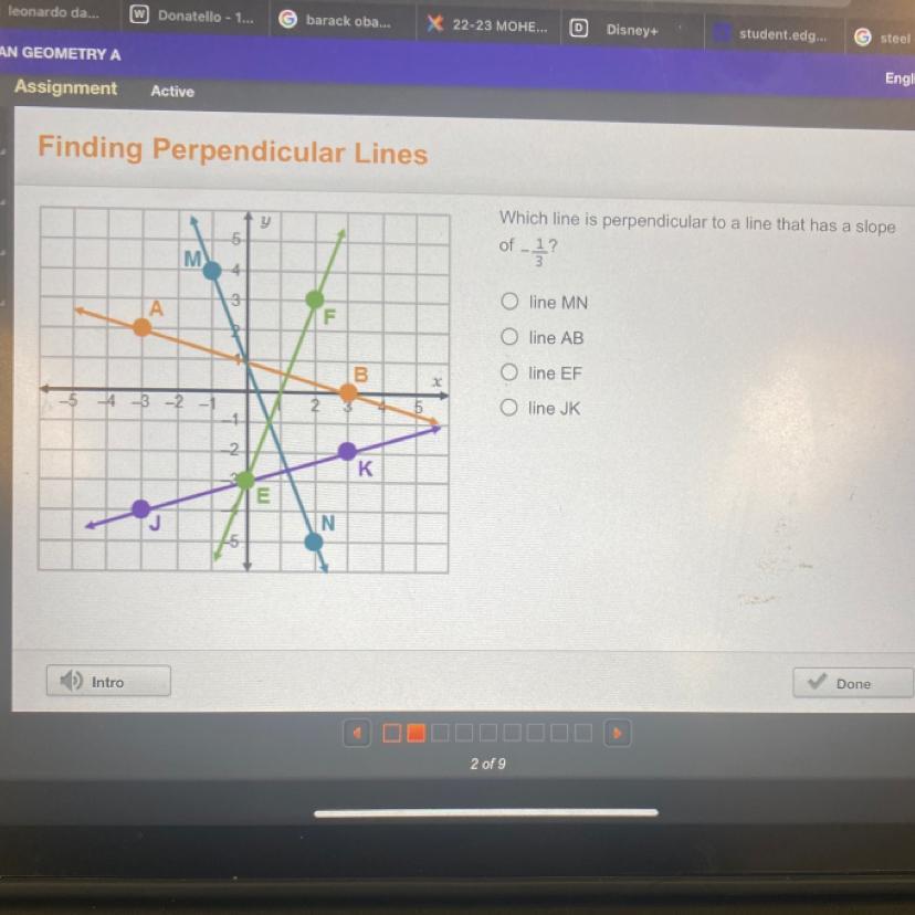 As x increases, the line with a slope of -2 increases. Line JK is the only line displayed that fits this. Line AB cannot be the solution because it is "falling" as x grows.