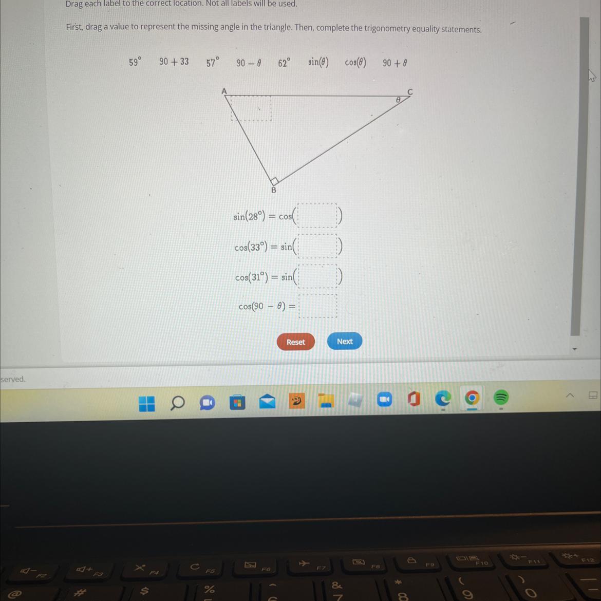 riangle. Then, complete the trigonometry equality statements.59°90 +33 57°90-8 62° sin(e) cos(0)Bsin(280) = cos(cos(33°) = sin(cos(31°) = sin(cos(908) =90 +0