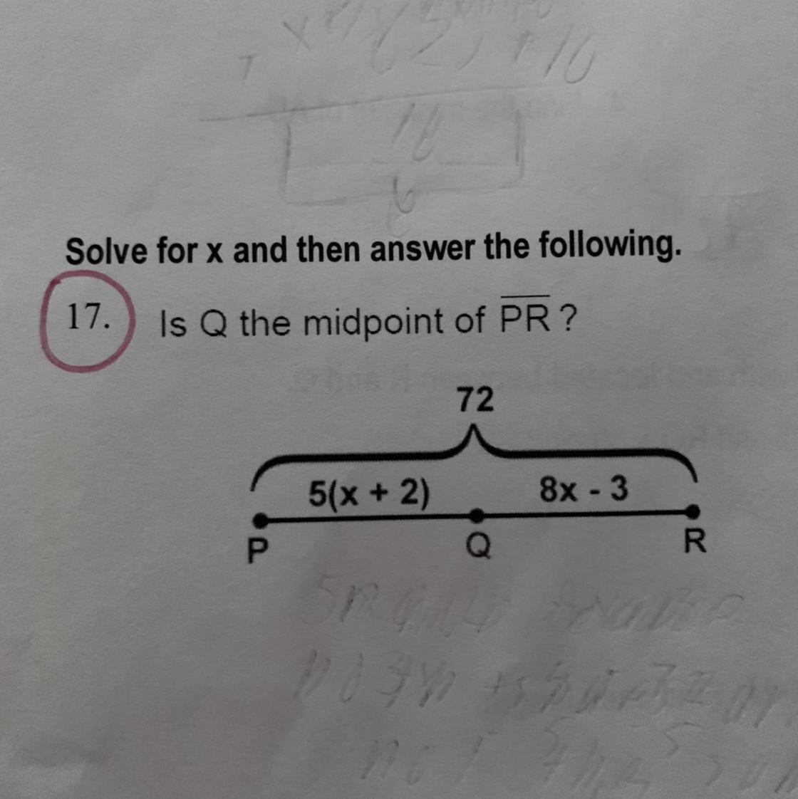 \displaystyle\\\overline {PQ}+\overline {QR}=\overline {PR}\\5(x+2)+(8x-3)=72