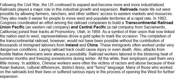 Things that before, the American people would have never thought possible, were happening, all thanks to the laborers in the factories of New York City, Philadelphia, and many other cities around the country. New modes of transportation were making it easier than ever to travel all the way from San Francisco, California to Pittsburgh, Pennsylvania. While working and living conditions for the factory workers, immigrants, and impoverished people in the cities were truly awful, in other ways the United States was moving forward and growing more powerful than ever before.