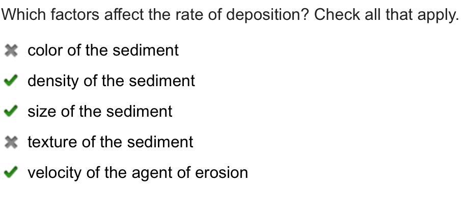 Hence,density of the sediment,size of the sediment as well as velocity of the agent of erosion will often affect the rate deposition.