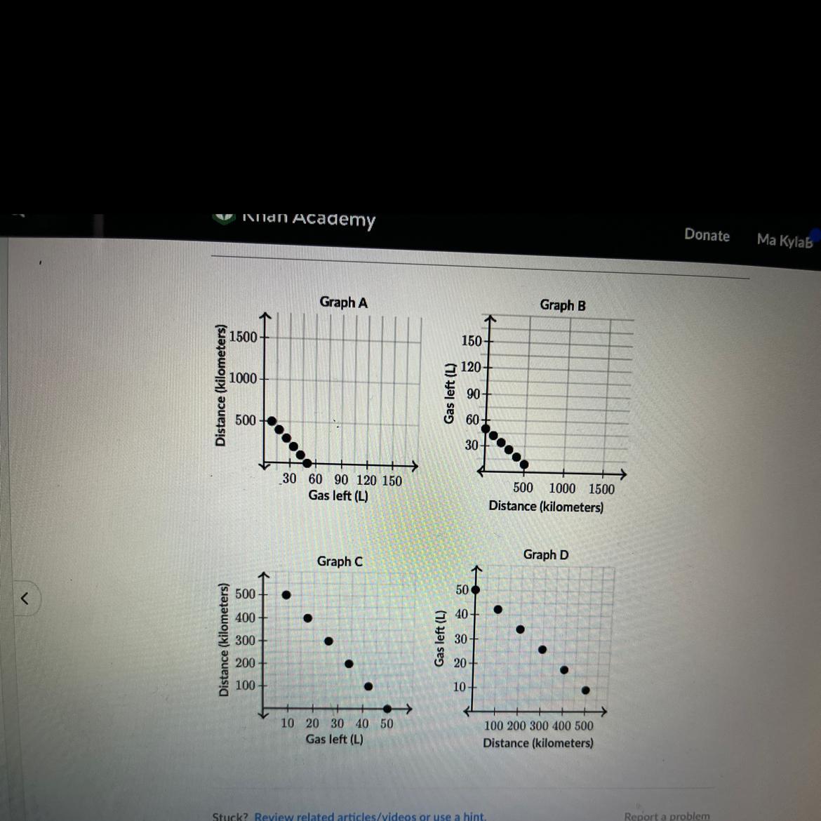 The independent variable from this question is simply the distance upon which the gas remaining in her tank depends on. Thus, the gas that is left in her tank is the dependent variable. The distance lies on the x-axis and the gas left lies on the y-axis.