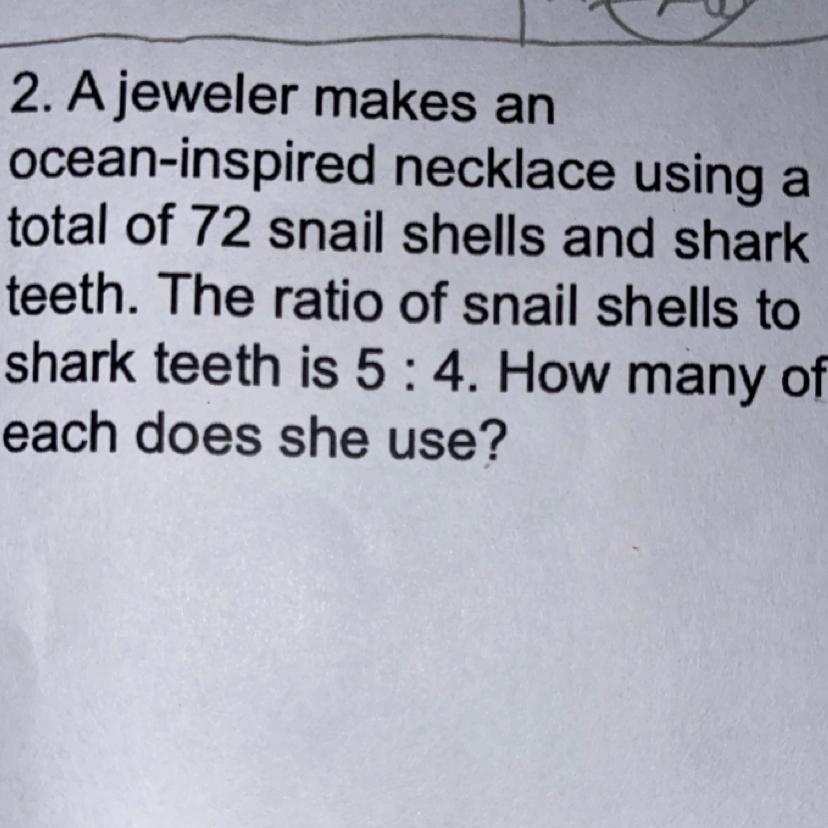 A jeweler makes an ocean-inspired necklace using a total of 72 snail shells and shark teeth. The ratio of snail shells to shark teeth is 5: 4.