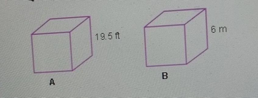 \begin{gathered} \text{Cube A} \\ l=19.5ft \end{gathered}\begin{gathered} \text{Cube B } \\ l=6m\text{ } \\ \text{ in ft}\Rightarrow\text{ 1m =3.28ft} \\ l=6\times3.28ft=19.68ft \end{gathered}