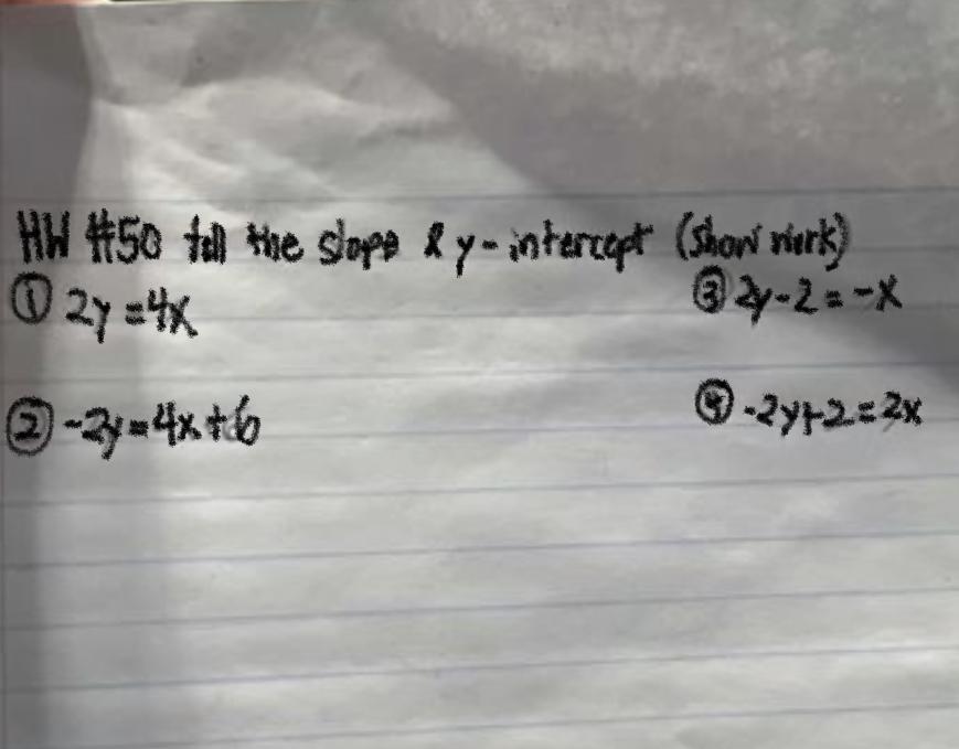 For #4, we get -2y+2=2(0), so -2y+2=0. If we subtract 2 from both sides, then divide by -2, we get y=1, and the y-intercept is (0,1).