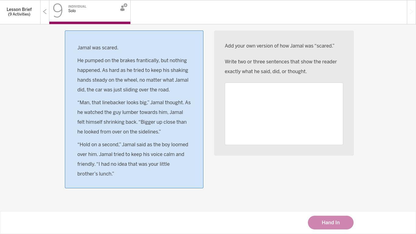 The most proficient writers rarely state an emotion. They usually describe it by showing what the character is feeling, how his body and mind are reacting to the emotion. That is what this question requires us to do. We must write a few sentences to describe Jamal's emotions, more specifically the fact that he is scared.