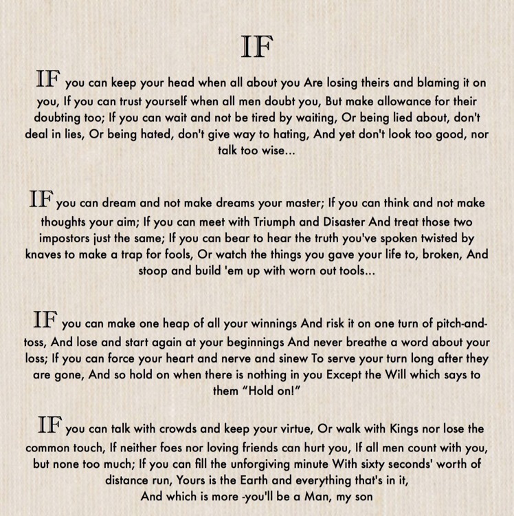 This poem was written from a man to his son, in which he tries to summarize the key for a meaningful life. There is a strong idea which tends to be repetitive: an advice to be wise and have poise in positive and negative circumstances of life, as walking with kings or experiencing loss and starting again.