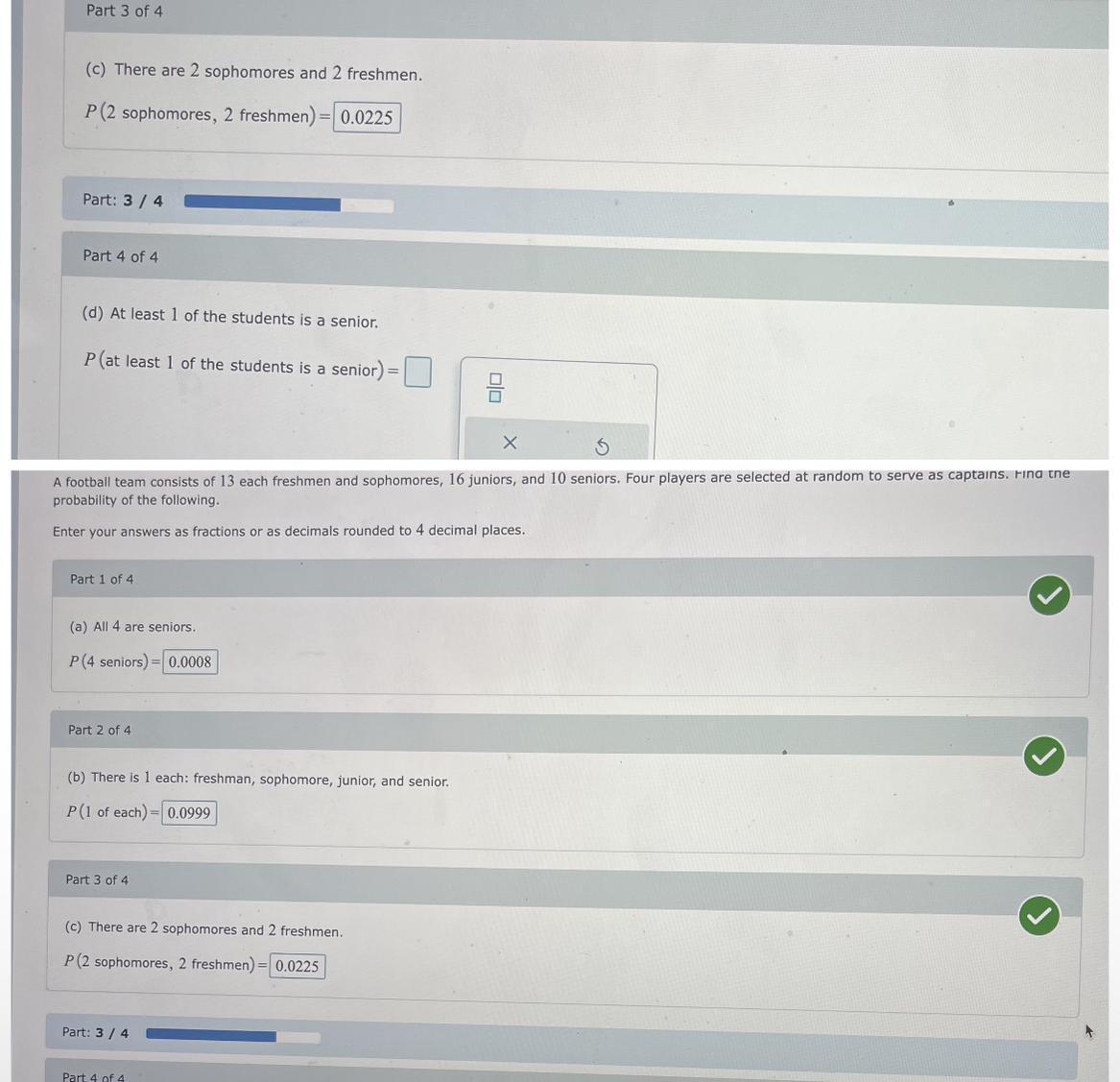 c) P(2 sophomore, 2 freshmen) = 0.0225.