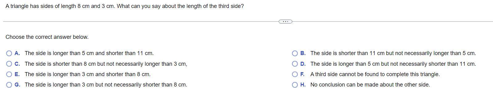, I am debating between or not having any choice.B) The side is shorter than 11 cm but not necessarily longer than 5m andc) The side is shorter than 8 cm but not necessarily longer than 3 cm