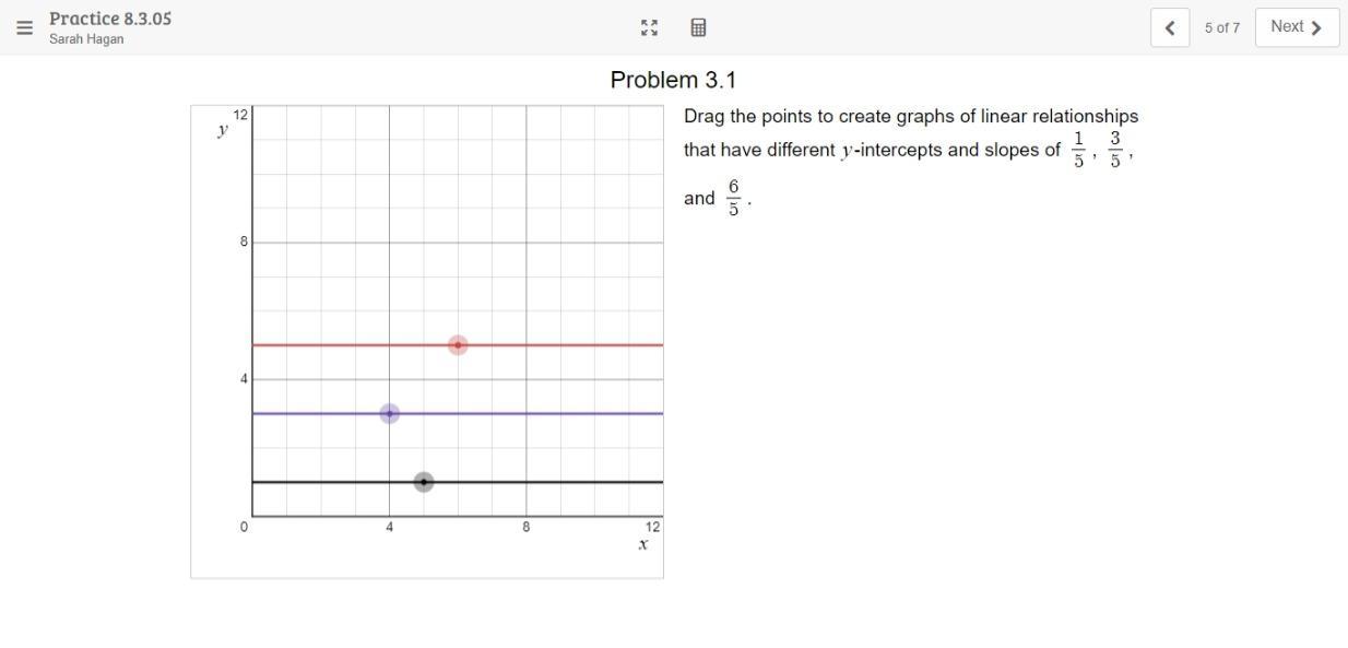need help with this Drag the points to create graphs of linear relationships that have different y-intercepts and slopes of 1/5,