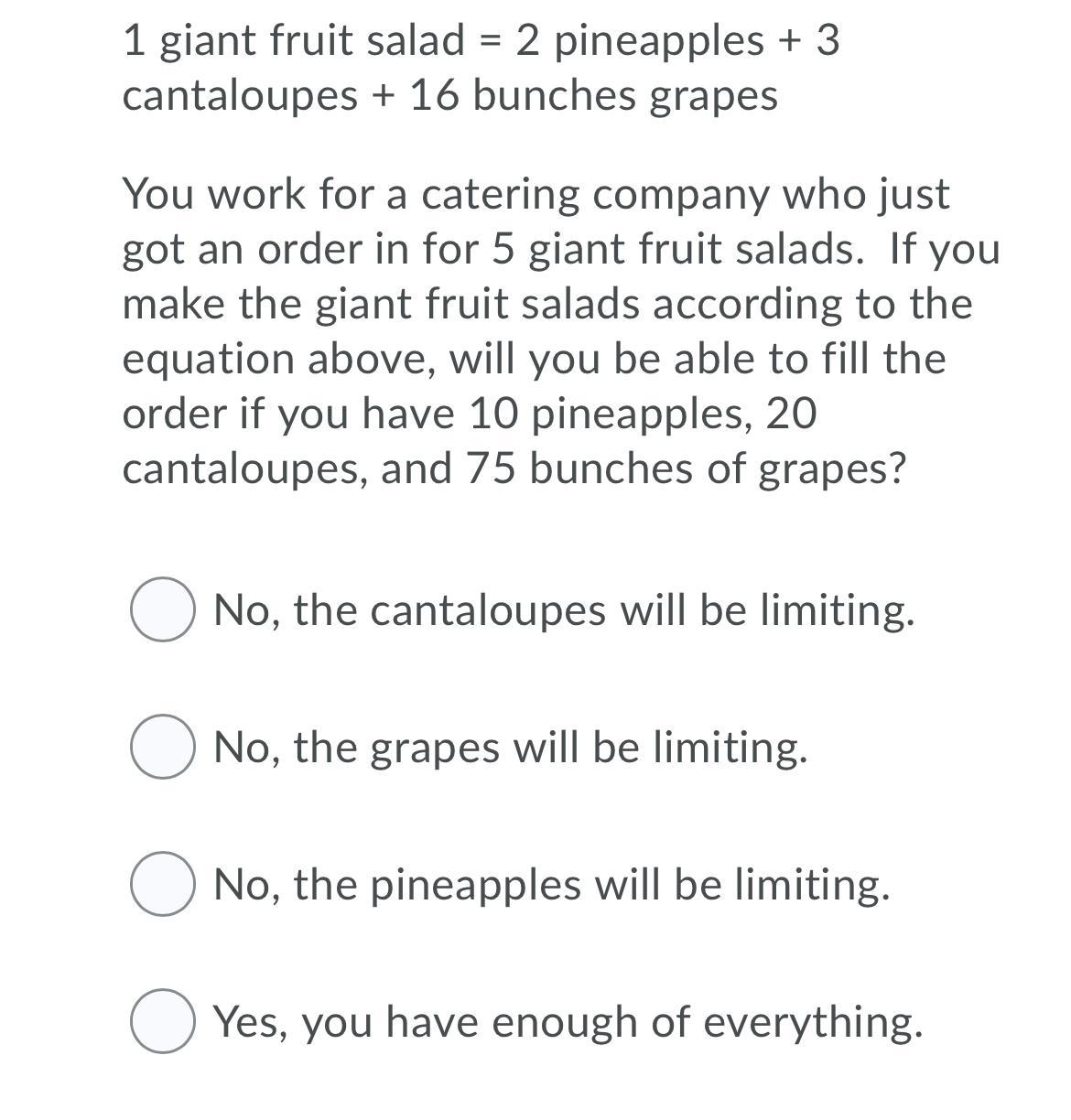 to the equation above, will you be able to fill the order if you have 10 pineapples, 20 cantaloupes, and 75 bunches of grapes?A.) No, the cantaloupes will be limiting.B.) No, the grapes will be limiting.C.) No, the pineapples will be limiting.D.) Yes, you have enough of everything.