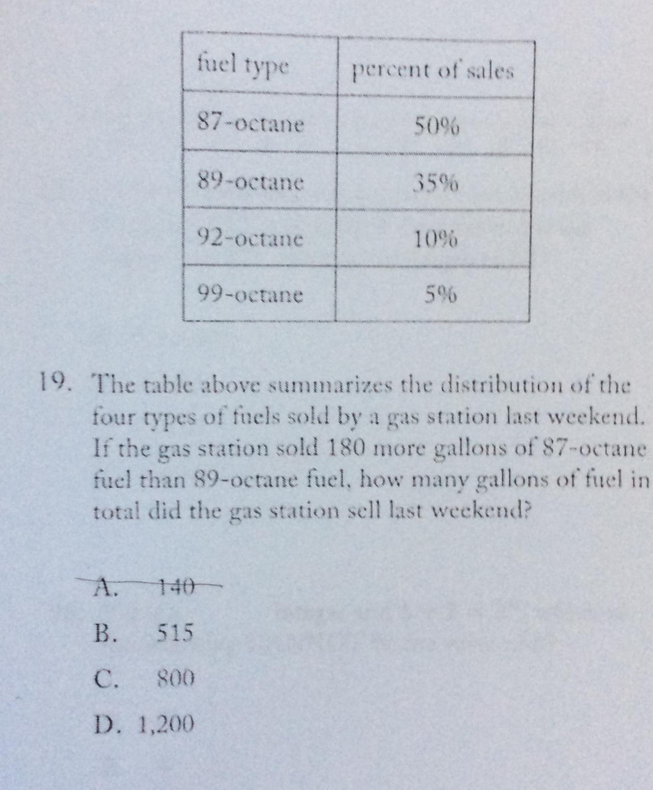 Let g represent the total number of gallons of fuel sold. Then the number of gallons of 87-octane sold is 0.50g, and the number of gallons of 89-octane sold is 0.35g. The difference is said to be 180 gallons: