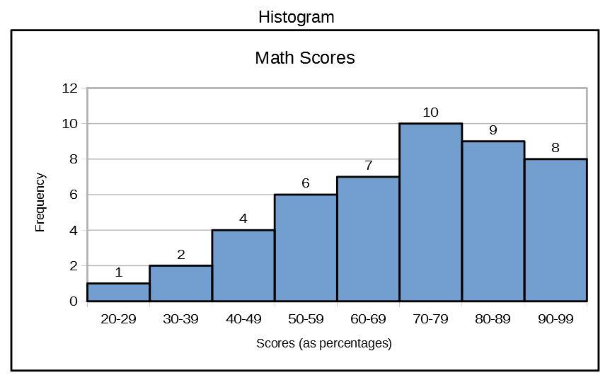 The height of each bar represents how many students are in that specific bin. The first bar is 1 unit tall because there's only one student in the 20% to 29% range (that 22% mentioned earlier).