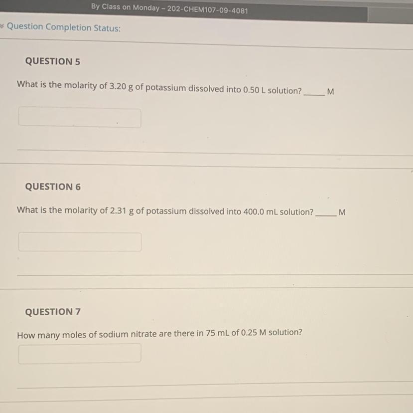 What is the molarity of 3.20 g of Potassium dissolved into 0.50 L solution.