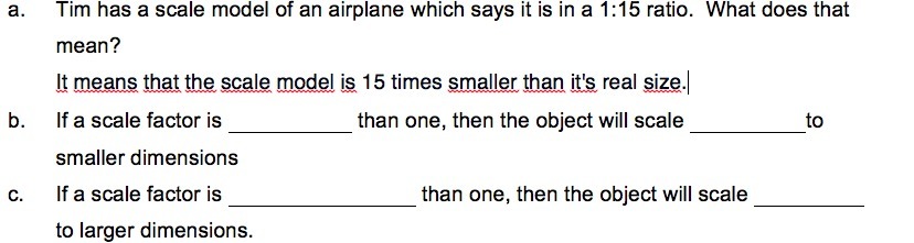 Q.1A.). Tim has a scale model of an airplane which says it is in a 1:15 ratio what shoes that mean? Answer: It means that the scale model of the Airplane; Tim has is 15 times smaller than it's real size.