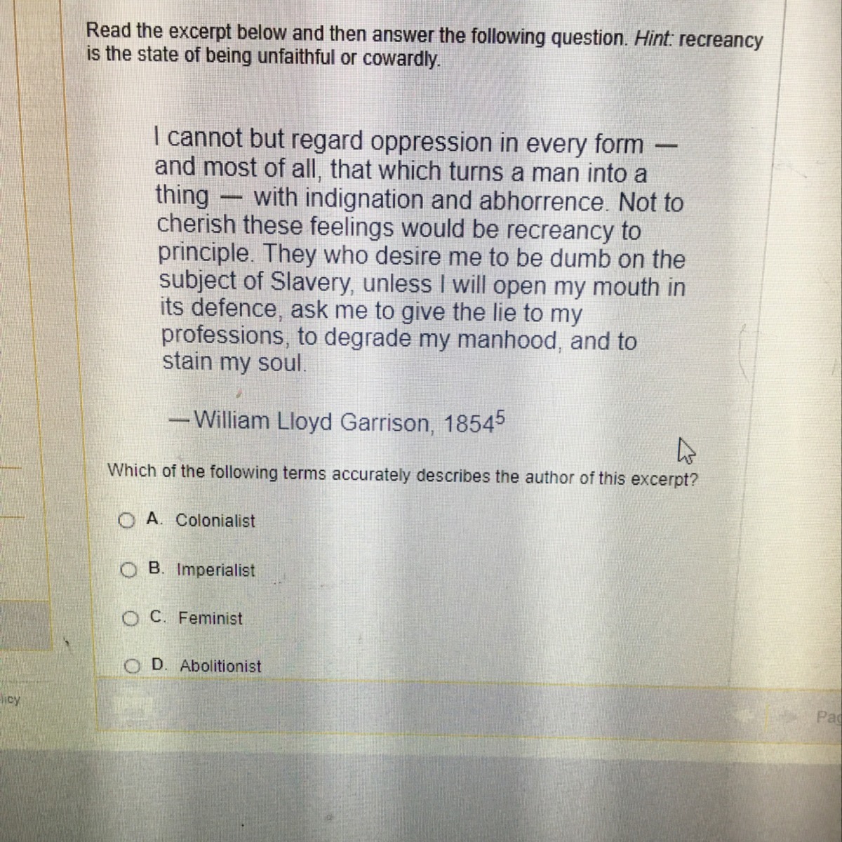 The correct answer to the question: Which of the following terms accurately describes the author of this excerpt, would be: D: Abolitionist.