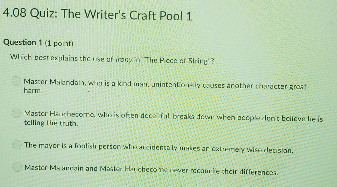 The main character, Master Hauchecorne, is accused of having found a pocket book containing some money inside it and is asked to return it. In reality, he has not found the pocket book, but a mere piece of string that he decided to pick up because he belives anything can be valuable if there is some use to it later on. While picking the string up, he's watched by an enemy of his, who becomes his accuser in the future.