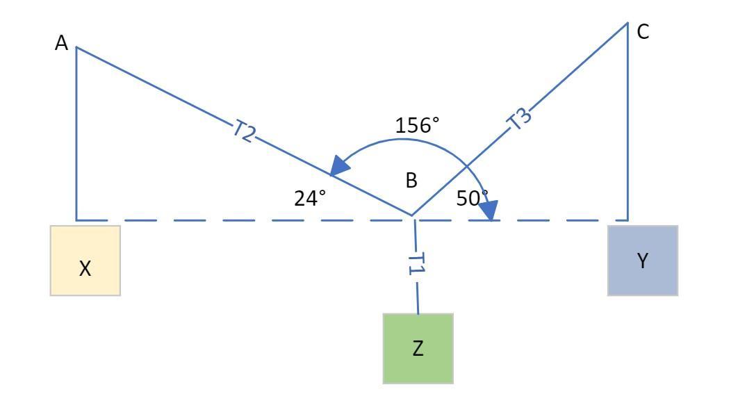 ∴ T₃ = (-12 - T₂ × sin(156°))/(sin(50°))