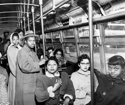 The seating arrangement on this southern bus reflects changes started by the ruling in Brown v. Board of Education. In the image we can see both White and African-American people using the same bus. It's even possible to watch a young African-American girl seated next to a white woman.