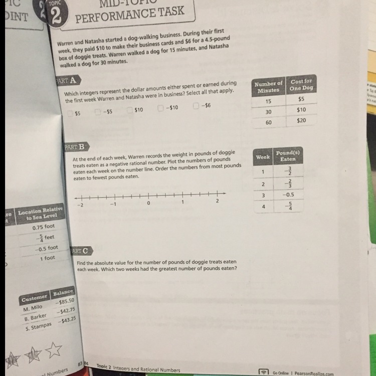 a) 5, 10, -10, -6 (5 and 10 earned from work, 10 and 6 spent on expenses)