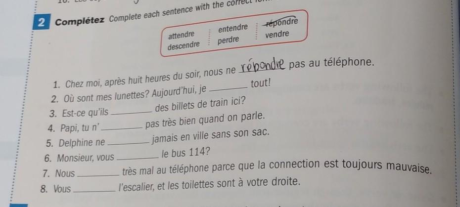5. Delphine ne descend jamais en ville avec son sac. (not sure of that one, it doesn't make sense) (<u>descendre</u>)