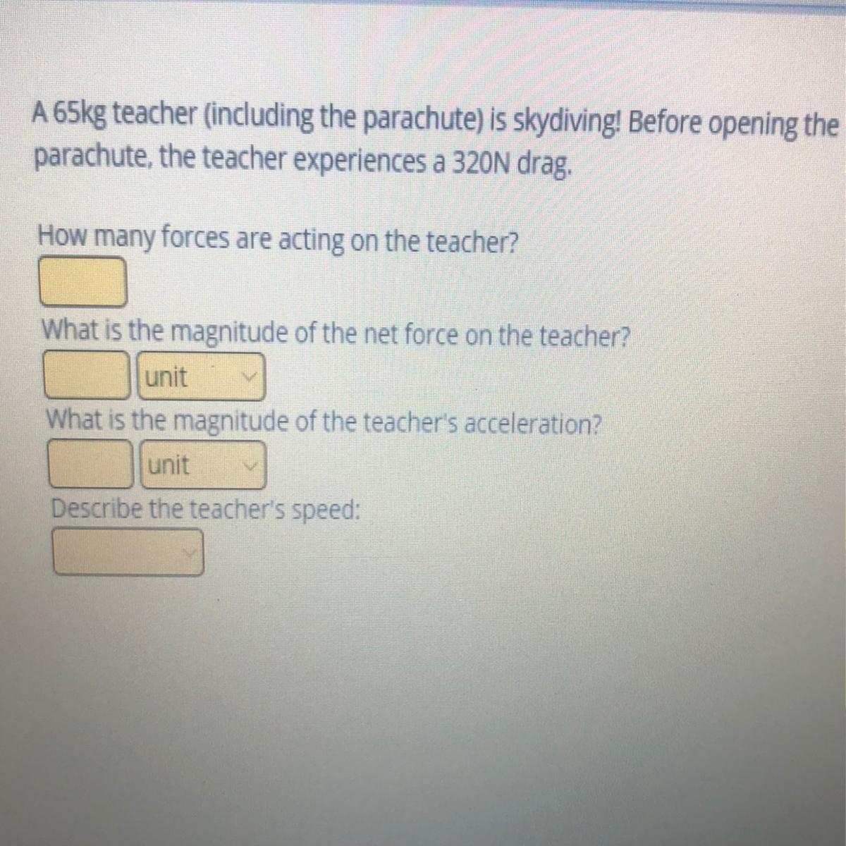 Like we said before, the force of drag is always opposite to the direction of motion. Since the teacher is falling down, the force of drag is exerted upward.