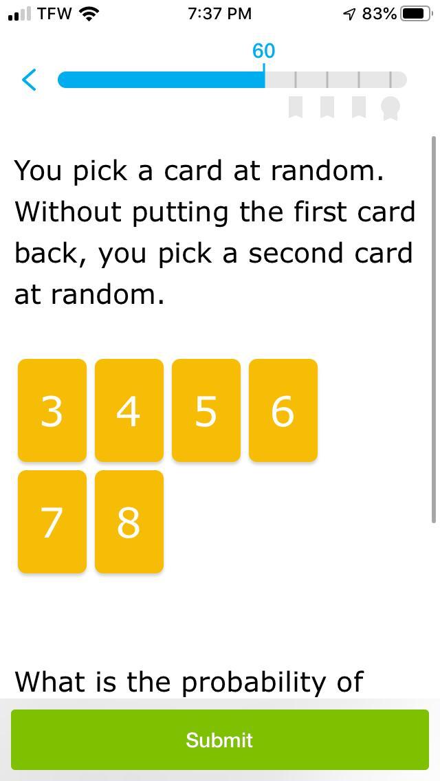 P (odd, no replacement, even) = 1/2* 3/5 = 3/10
