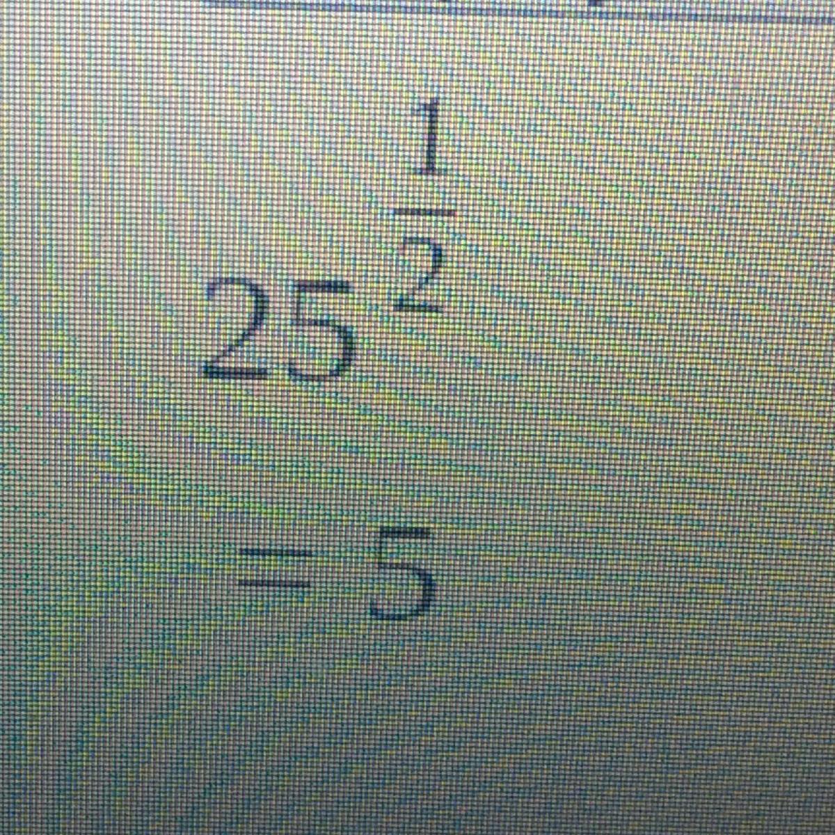 The answer is 5. 25^1/2 is the same thing as the square root of 25. The square root of 25 is positive 5 or negative 5 because