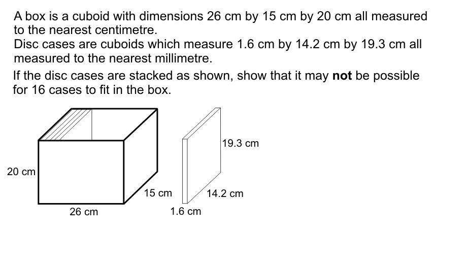 Temporarily ignoring the 14.2 cm and 19.3 cm measurements, we multiply this 1.6 cm thickness by 16, obtaining a total thickness for the stack of cases of 25.6 cm.