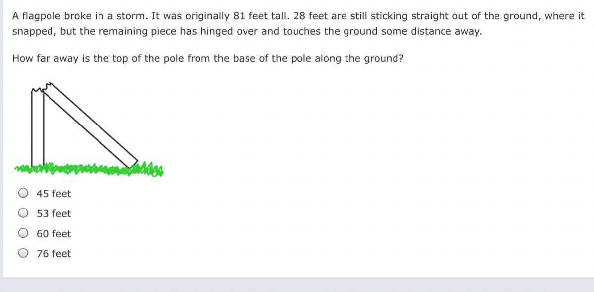 To find the hypotenuse of that triangle, you would have to do 81-28, because that's the portion that snapped. That equals 53.