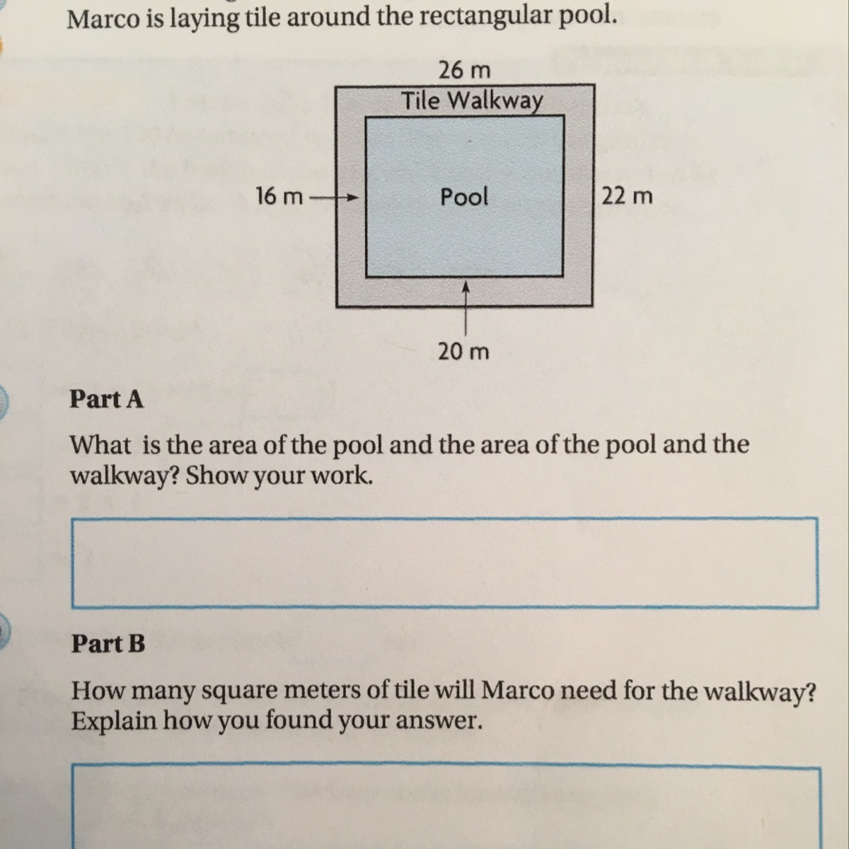 The swimming club's indoor pool is a rectangular building . Marco is laying tile around the rectangular pool . Pls answer A- B