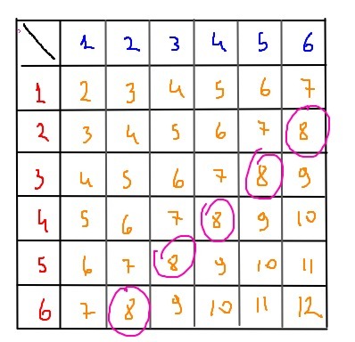and so on, we see that there are 6*6=36 total outcomes, and 5 of these outcomes produce a sum equal to 8.