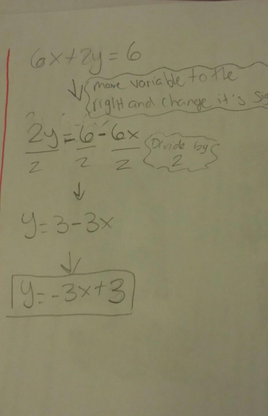 - Then you divide the equation by 2 like in the photo above and that should give you y=3-3x
